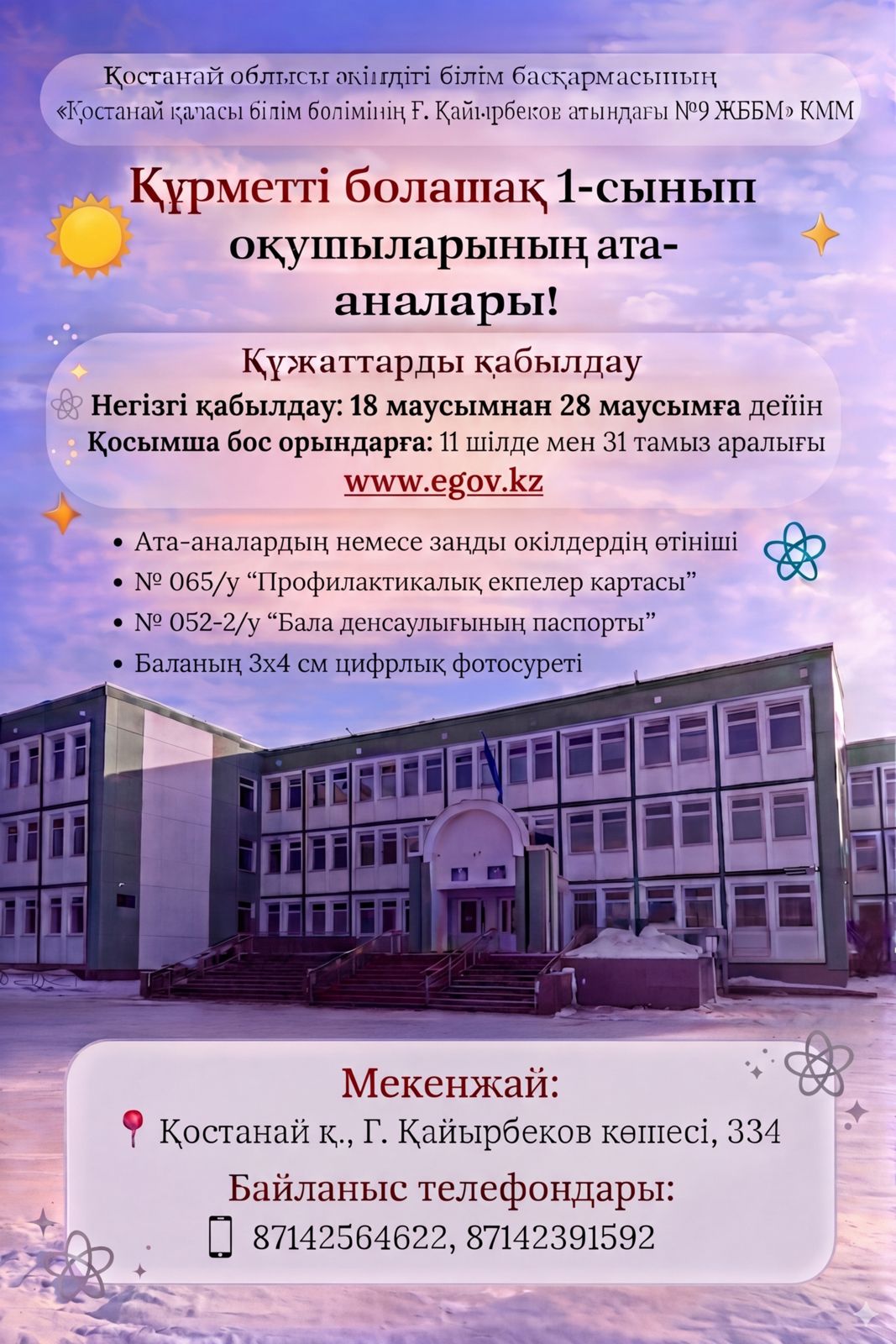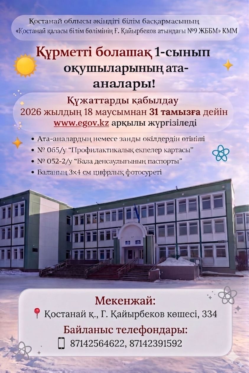 Орысша атауы: КОММУНАЛЬНОЕ ГОСУДАРСТВЕННОЕ УЧРЕЖДЕНИЕ "ОБЩЕОБРАЗОВАТЕЛЬНАЯ ШКОЛА №9 ИМЕНИ Г. КАЙЫРБЕКОВА ОТДЕЛА ОБРАЗОВАНИЯ ГОРОДА КОСТАНАЯ" УПРАВЛЕНИЯ ОБРАЗОВАНИЯ АКИМАТА КОСТАНАЙСКОЙ ОБЛАСТИ