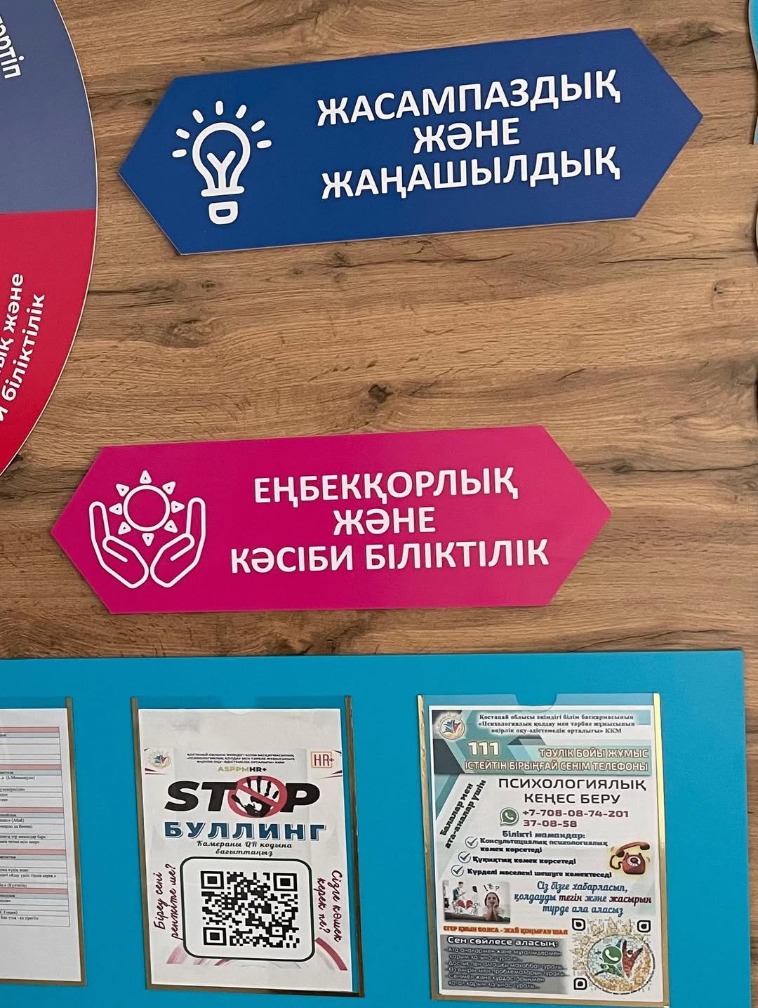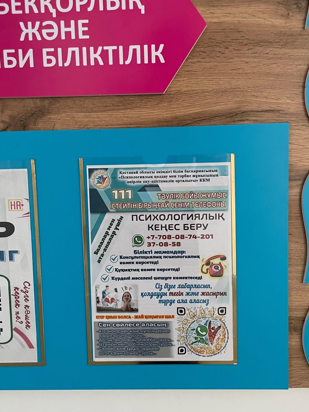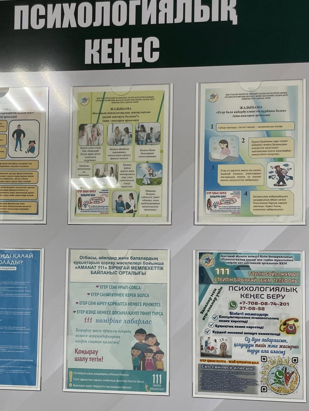 Психологиялық қолдау және тәрбие жұмысы жөніндегі өңірлік оқу-әдістемелік орталықтың ақпараттық материалдары мен сенім телефондары мектебіміздің барлық ақпараттық стендтерінде, әр қабатта орналастырылған.